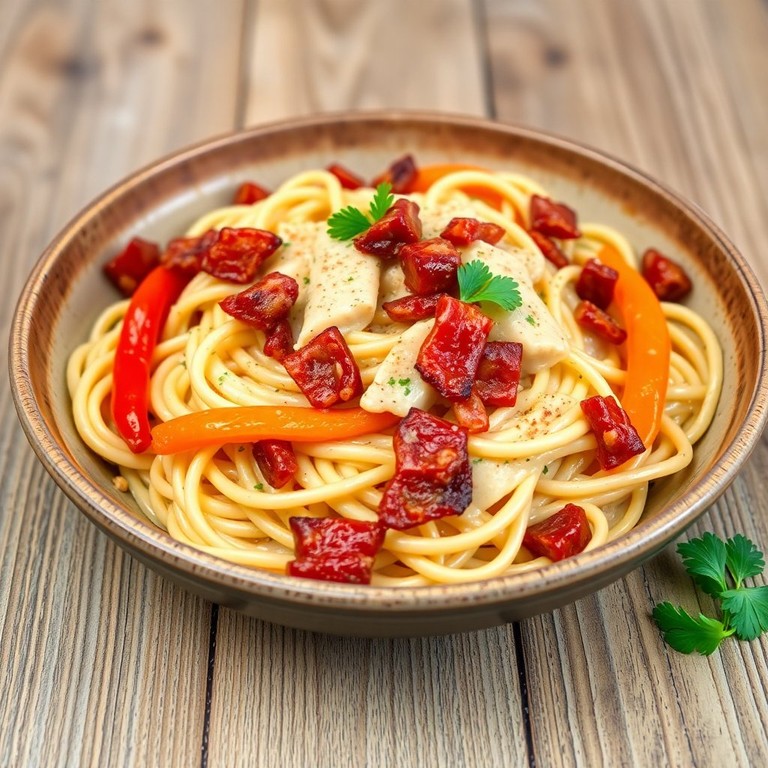 Cremige Teigwaren mit Speck und Peperoni