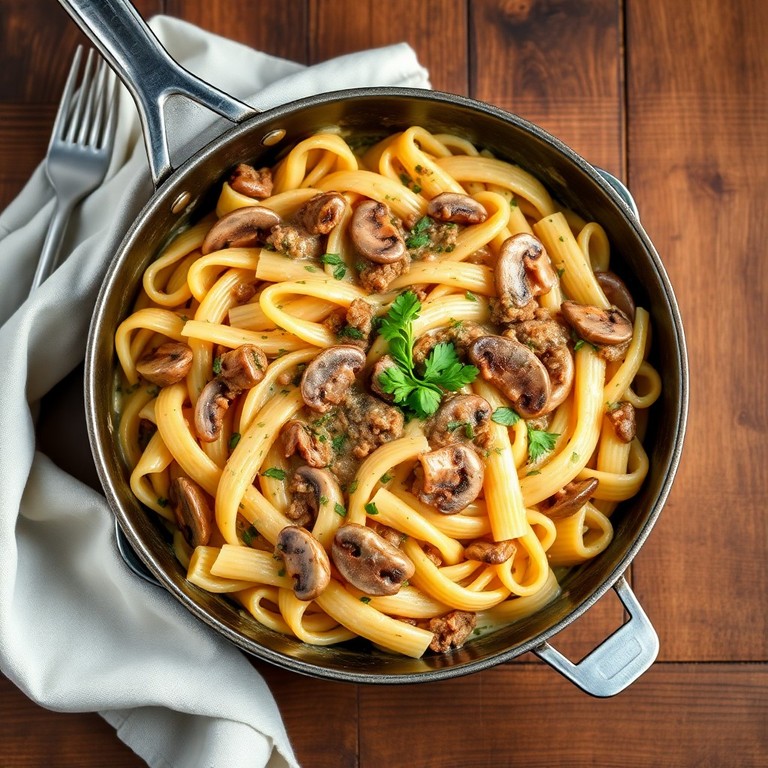 Sahne-Zwiebel-Mett-Gemüsepfanne mit Pasta
