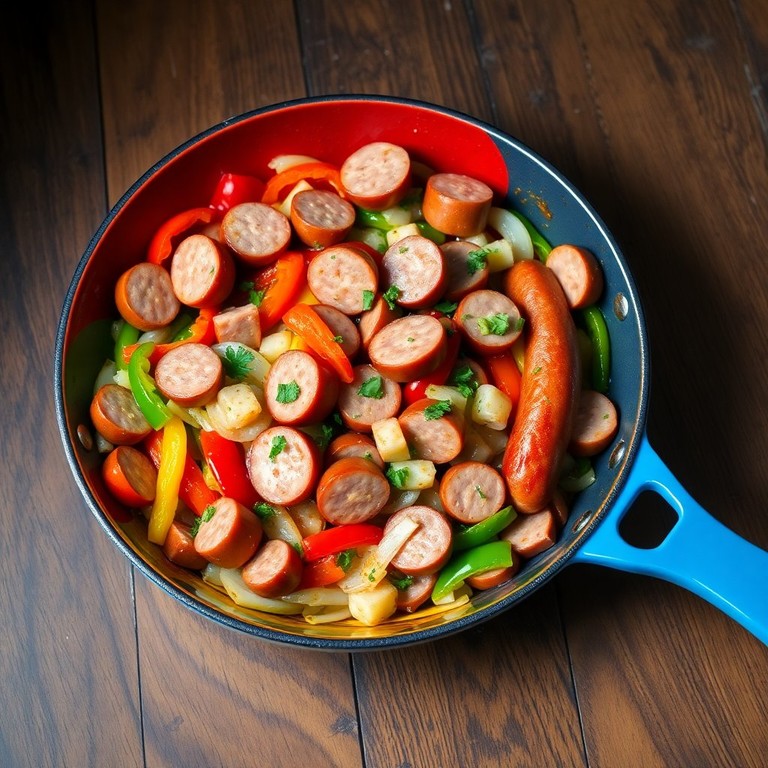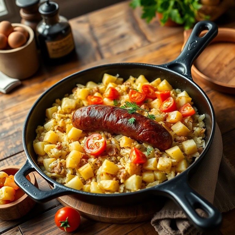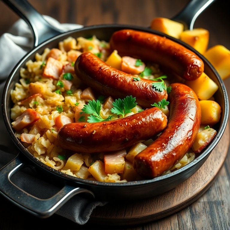 - Rustikale Sauerkrautpfanne mit Thüringer Rostbratwurst und Kartoffeln