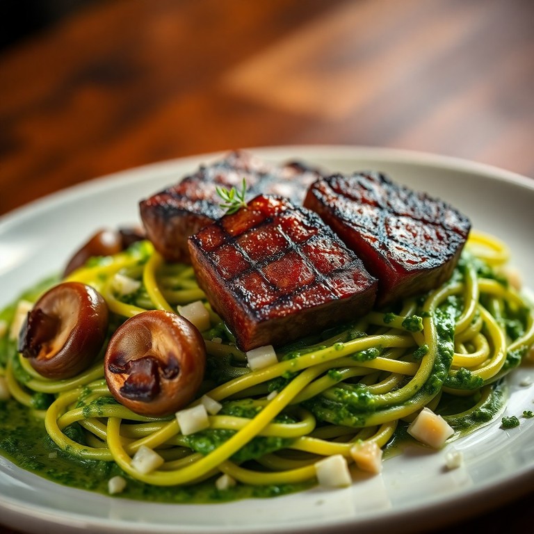 - Hirschfilet-Medaillons mit Basilikumpesto-Pasta und Austernpilzen