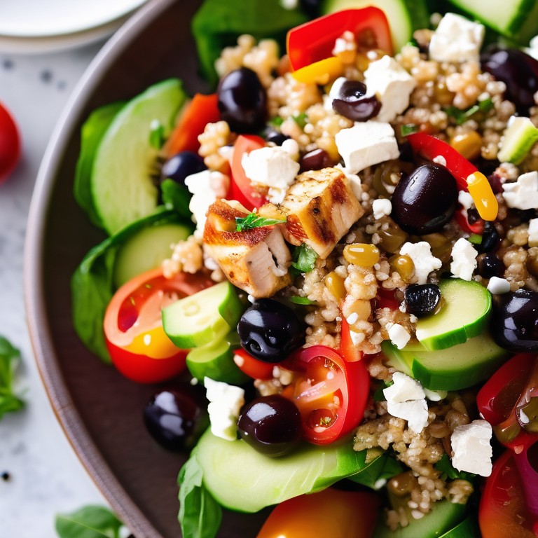 Cette salade fraîche et colorée combine des saveurs méditerranéennes avec du quinoa et du poulet grillé pour un repas sain et équilibré. Parfaite pour un déjeuner ou un dîner léger.