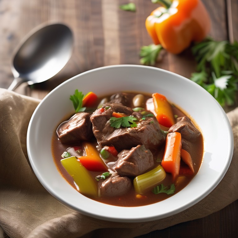 Un délicieux ragoût de bœuf mijoté avec des carottes, du céleri et des poivrons dans une sauce savoureuse.