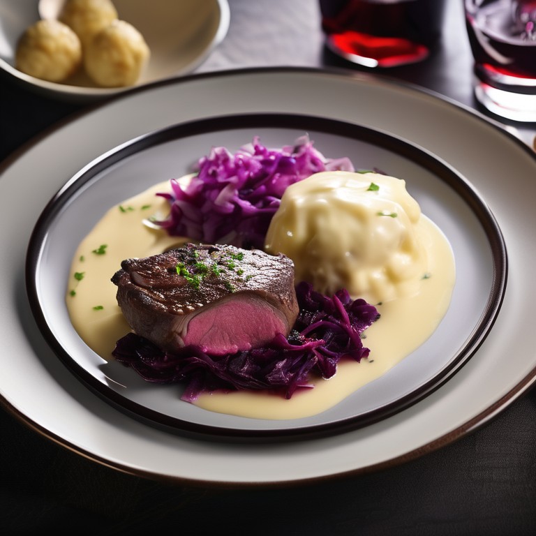 Ein köstliches Gericht mit zartem Wildbraten, aromatischem Rotkohl, Kartoffelklößen und einer cremigen Bechamel- und Hollandaise-Soße.