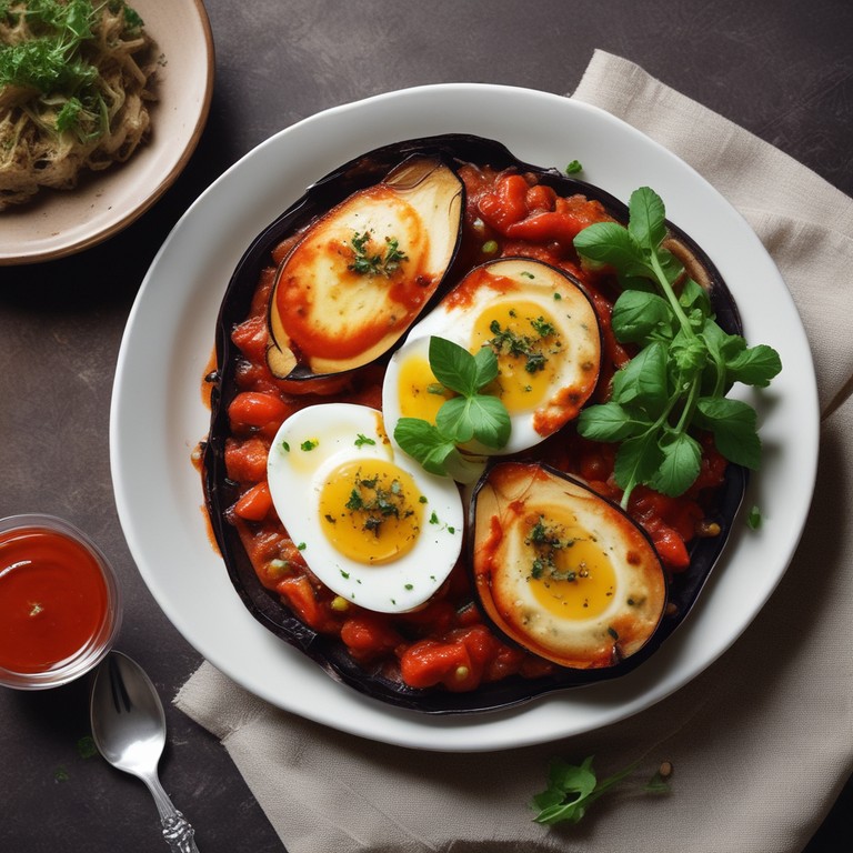 Ein köstliches vegetarisches Gericht aus gebackenen Auberginen mit einer herzhaften Tomatensoße. Perfekt für ein gesundes Abendessen.