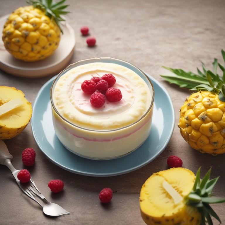 Ein köstliches und erfrischendes Dessert mit einer Mischung aus Himbeeren, Ananas, Quark, Pudding und Sahne.