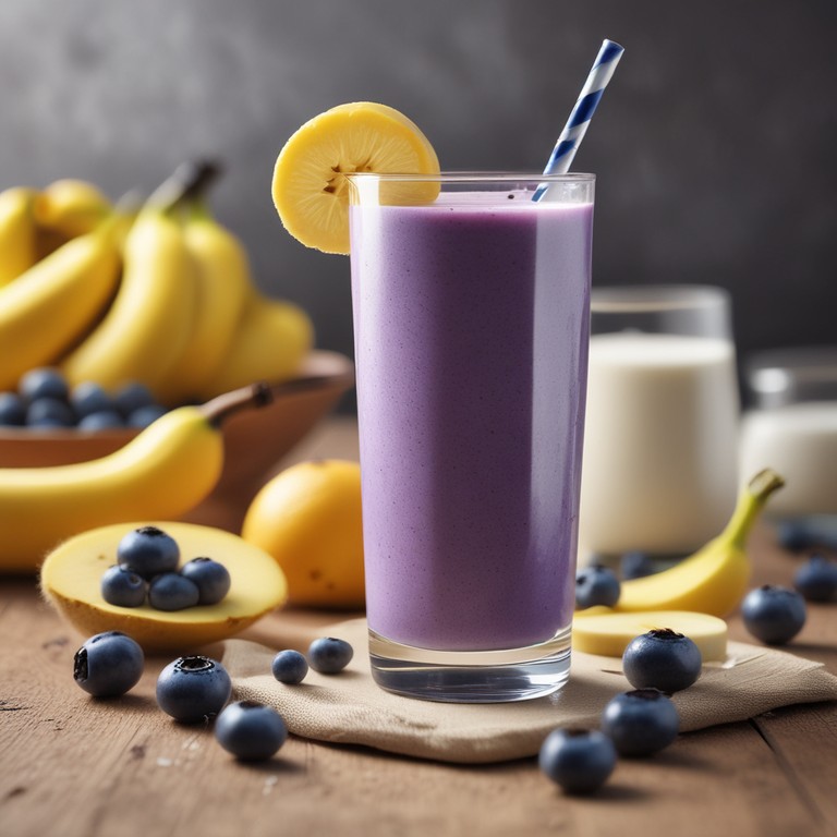 Un smoothie rafraîchissant et sain préparé avec des myrtilles et des bananes fraîches. Parfait pour une collation rapide ou un petit-déjeuner énergétique.