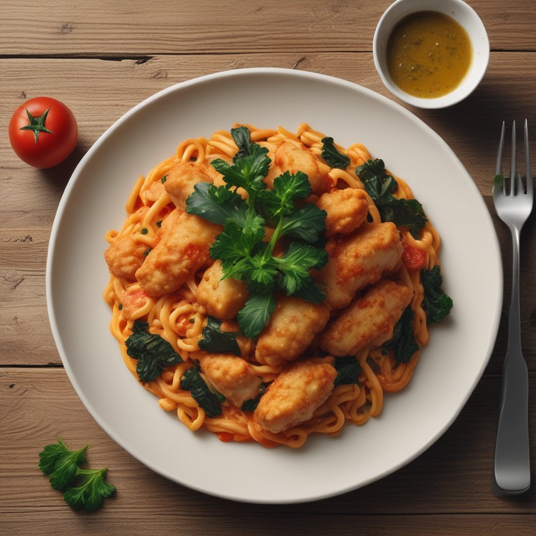 Ein köstliches Gericht mit Kartoffelpüree-Nudeln in würziger Tomatensauce, gekochtem Ei, frischem Spinat und knusprigen Chicken Tenders.