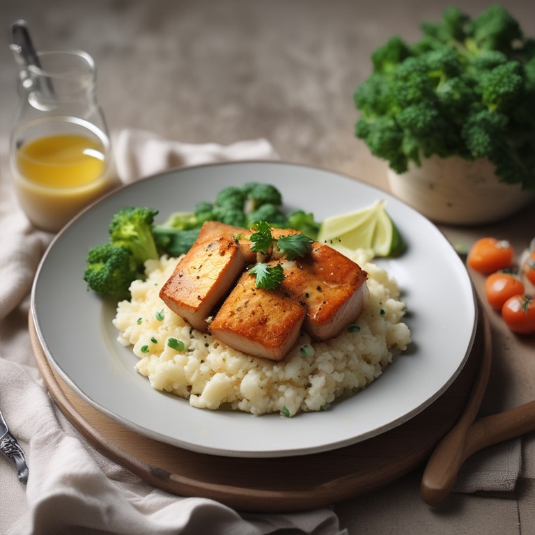 Ein köstliches und einfaches Low-Carb-Gericht, das aus gebratenem Lachs und Blumenkohlreis besteht. Der Lachs wird saftig und aromatisch angebraten und mit frischem Zitronensaft verfeinert. Der Blumenkohlreis ist eine kohlenhydratarme Alternative zu herkömmlichem Reis und wird mit Knoblauch und Petersilie veredelt. Dieses Gericht ist gesund, nahrhaft und perfekt für eine kohlenhydratarme Ernährung geeignet.
