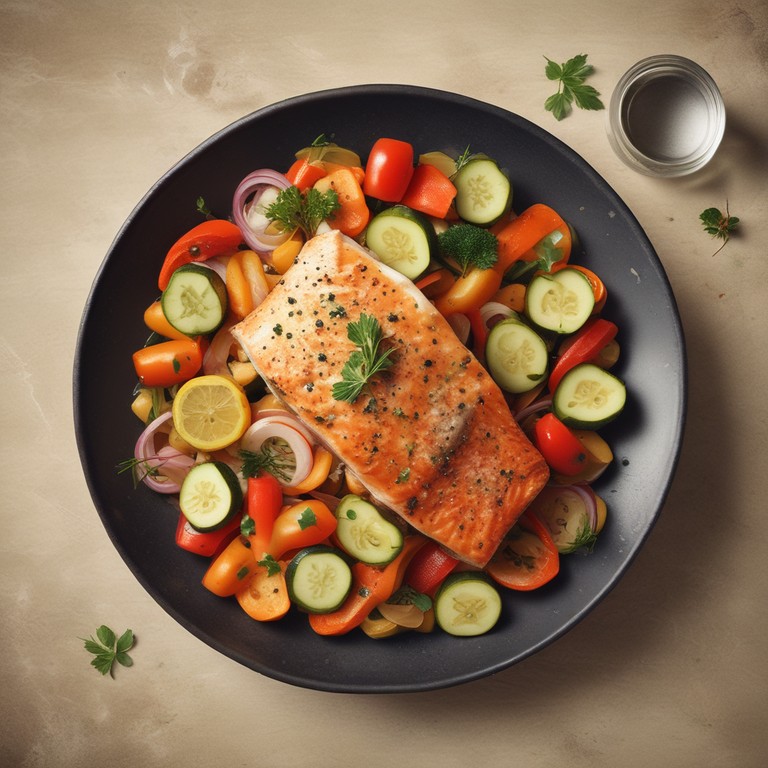 Ein köstliches und gesundes Gericht, das gebratenen Lachs mit einer Vielzahl von frischem Gemüse kombiniert. Die Zitrone verleiht dem Gericht eine erfrischende Note, während die frischen Kräuter für zusätzliche Aromen sorgen. Perfekt für alle, die eine vegetarische Option mit Fisch suchen und ohne Tomaten auskommen möchten.
