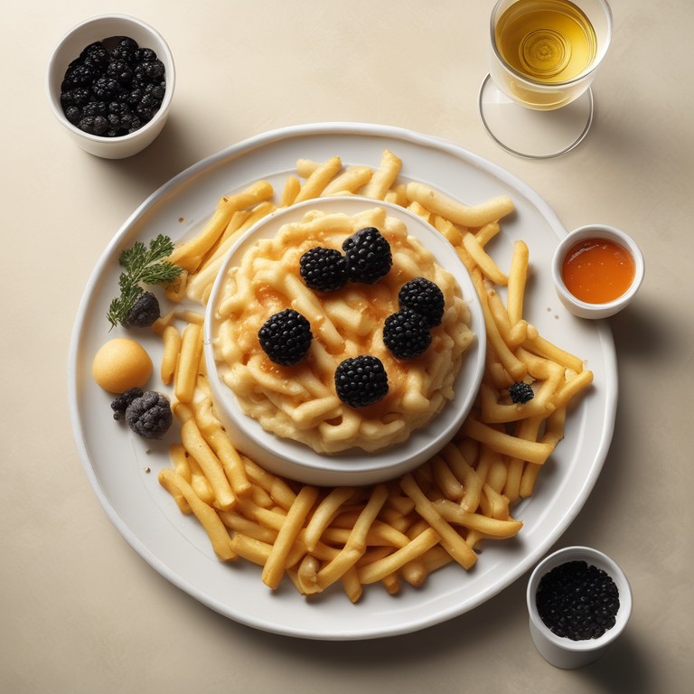 Ein luxuriöses und extravagantes Gericht, das goldene Pommes mit Hefeklöße, Kaviar, Trüffel und aromatischen Zwiebeln kombiniert. Die perfekte Kombination aus knusprigen, goldenen Pommes und erlesenen Zutaten wie Kaviar und Trüffel. Ein Festmahl für besondere Anlässe oder um sich selbst zu verwöhnen.