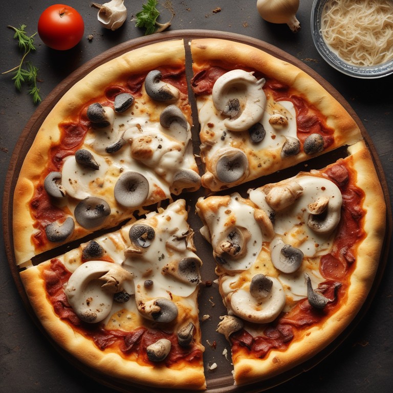 Una deliciosa pizza casera de pollo y champiñones con queso derretido en la parte superior, recién horneada en el horno. Esta pizza es una combinación perfecta de sabores y texturas que seguramente satisfará tus antojos. ¡Disfruta de una porción sabrosa y reconfortante de esta pizza casera!