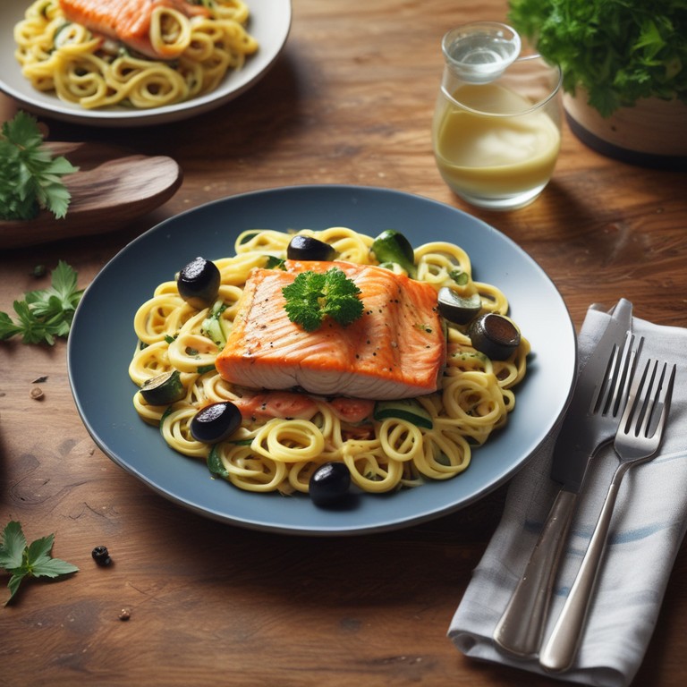 Dieses Rezept kombiniert zarten Lachs mit frischem Gemüse und cremigen Nudeln zu einem köstlichen Gericht. Ideal für ein schnelles Abendessen oder ein besonderes Essen mit Freunden.