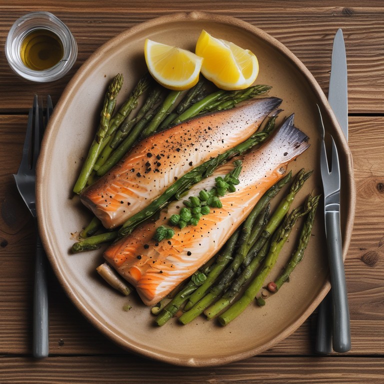 Una deliciosa receta de trucha al horno, acompañada de espárragos frescos y un toque de alcaparras y limón, perfecta para una cena elegante.