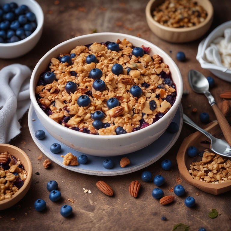 Een heerlijke en gezonde zoete crumble met skyr en blauwe bessen, perfect als dessert of als gezonde snack.