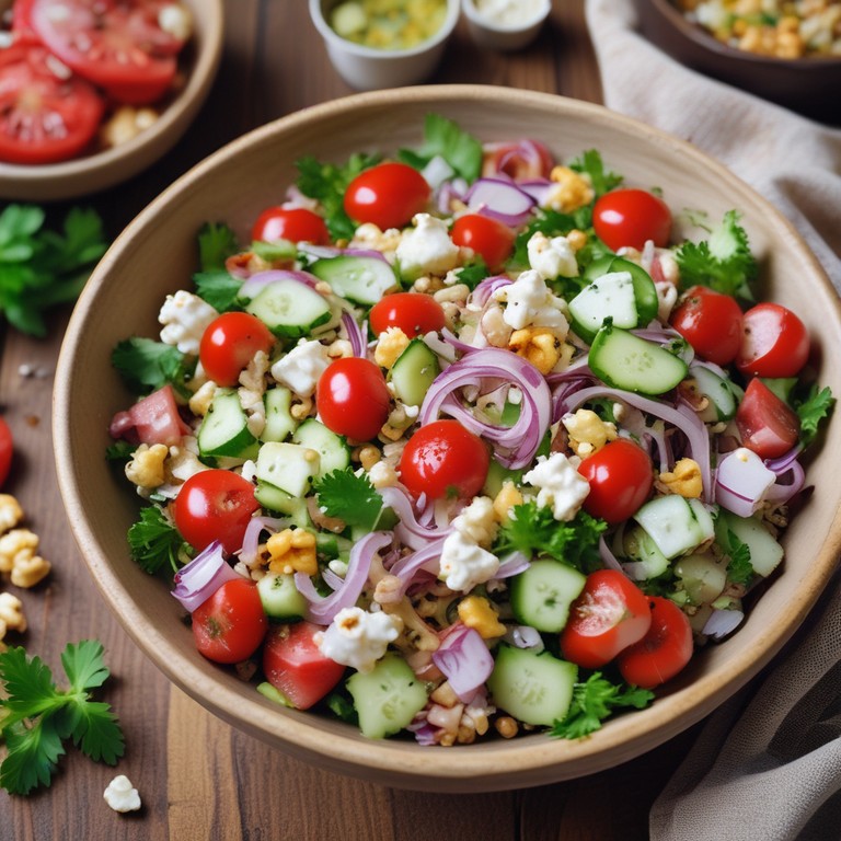 Ein erfrischender und leichter Salat, der die Süße von Tomaten und die Frische von Gurken kombiniert, perfekt für warme Tage. Das knusprige Popcorn verleiht dem Gericht eine unerwartete Textur und macht es zu einem einzigartigen Erlebnis.