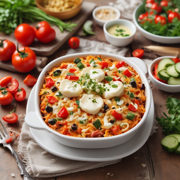 Ein köstlicher Auflauf, der die Aromen des Mittelmeers vereint, mit einer Kombination aus Reis, Nudeln, frischem Gemüse und zwei verschiedenen Käsesorten.