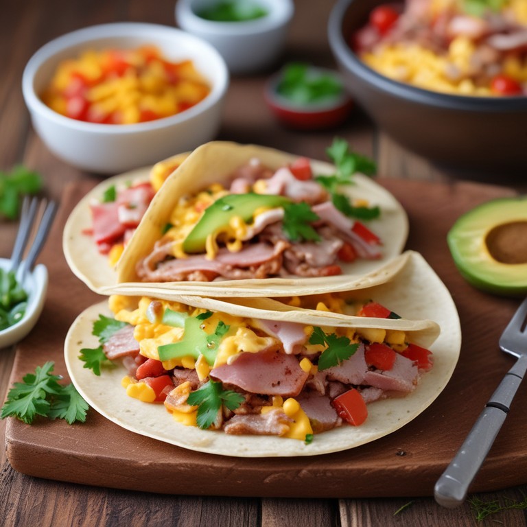Un delicioso desayuno en forma de tacos, llenos de huevos revueltos, salchicha, jamón y tomate, perfectos para comenzar el día con energía.