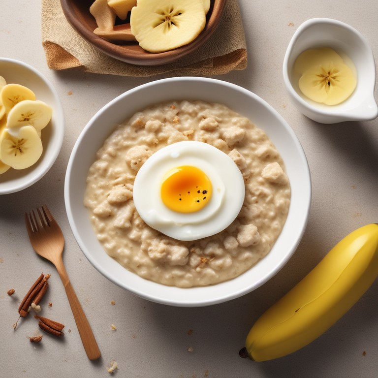 Ein nahrhaftes und proteinreiches Frühstück, das Haferflocken, Eier und Whey-Protein kombiniert, um einen milden und leckeren Start in den Tag zu bieten.