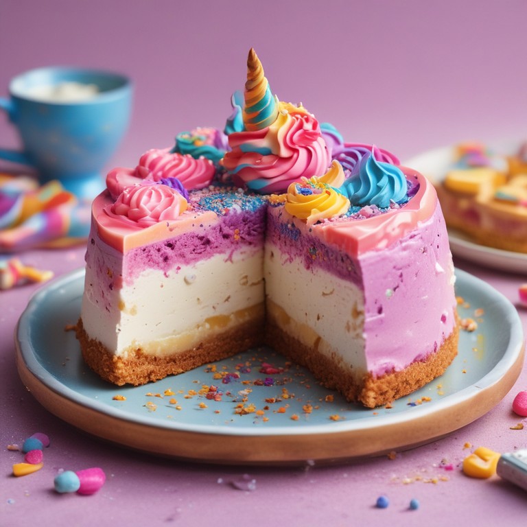 This Unicorn Cheesecake Sparklepony Edition is a magical dessert that combines a creamy cheesecake with a swirl of vibrant colors. Topped with whipped cream, edible glitter, and rainbow sprinkles, it's a feast for both the eyes and the taste buds. Perfect for unicorn lovers and special occasions!