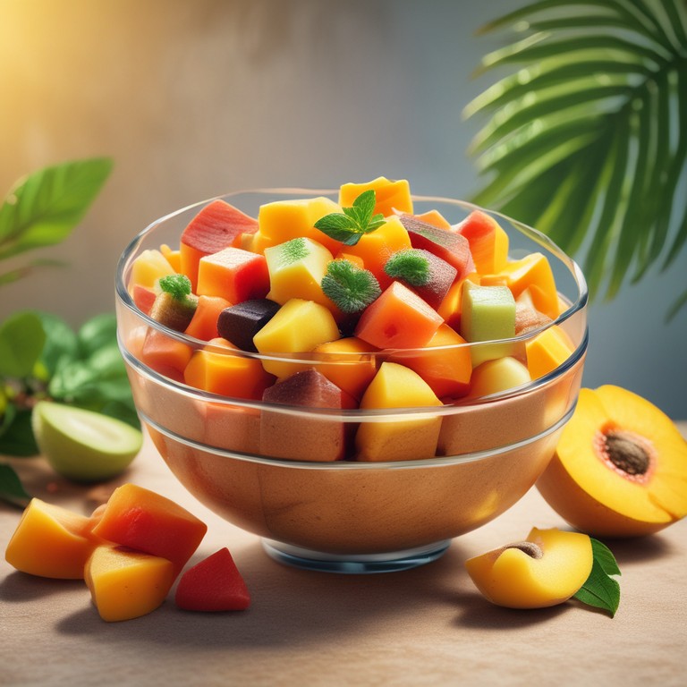 Una refrescante ensalada de frutas tropicales que combina la dulzura de la papaya, el mango, la guayaba y el banano, ideal para un día caluroso.