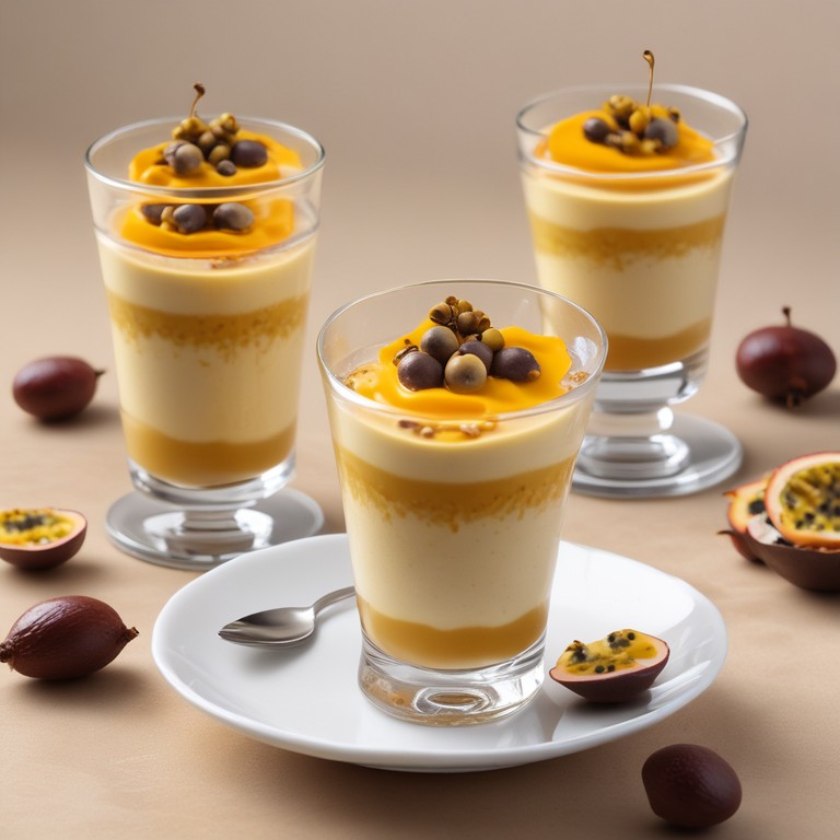 Uma mousse leve e refrescante, combinando o sabor ácido do maracujá com a suavidade do chocolate, perfeita para sobremesas.