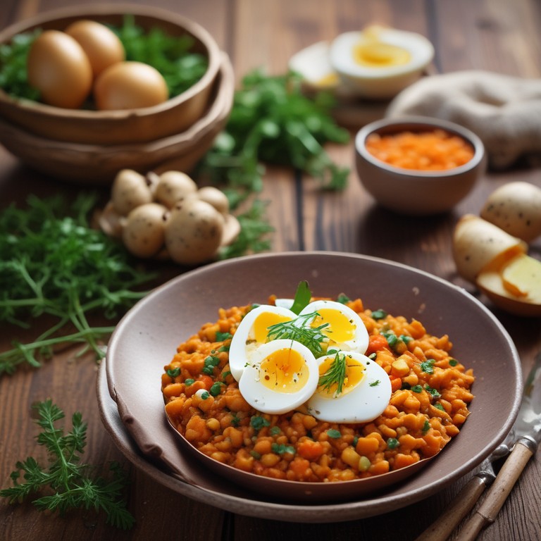 Ein herzhaftes und nahrhaftes Gericht mit roten Linsen, Kartoffeln und Eiern, perfekt für eine gesunde Mahlzeit.