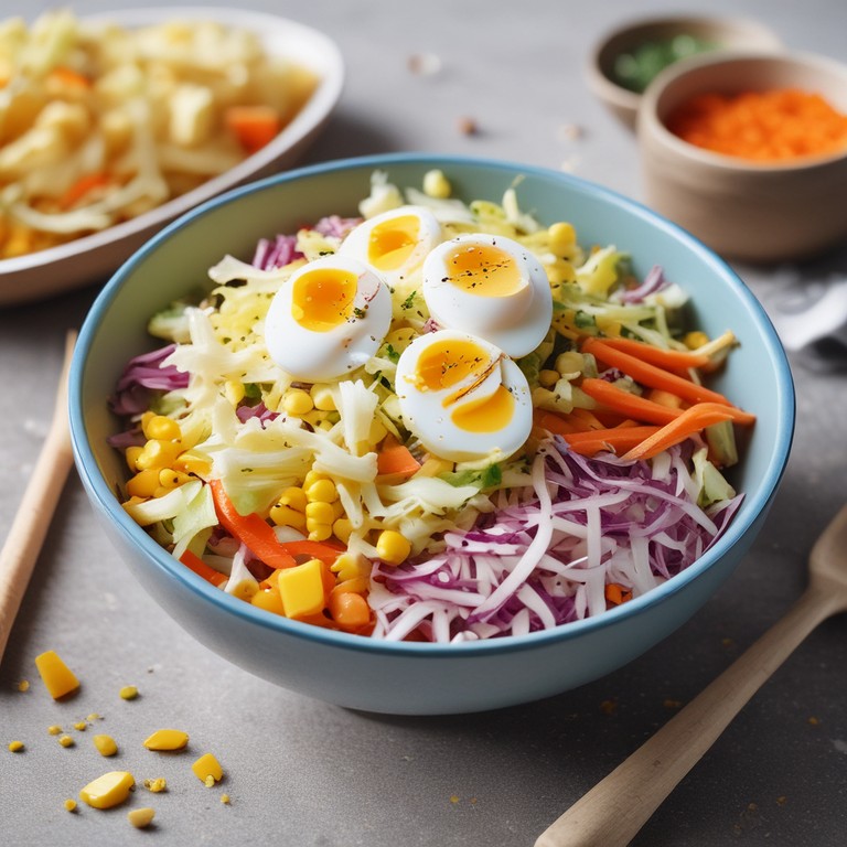 Uma salada refrescante e nutritiva, perfeita para acompanhar refeições ou como um lanche leve. A combinação de ovos cozidos, repolho crocante, cenoura e milho traz uma explosão de sabores e texturas.