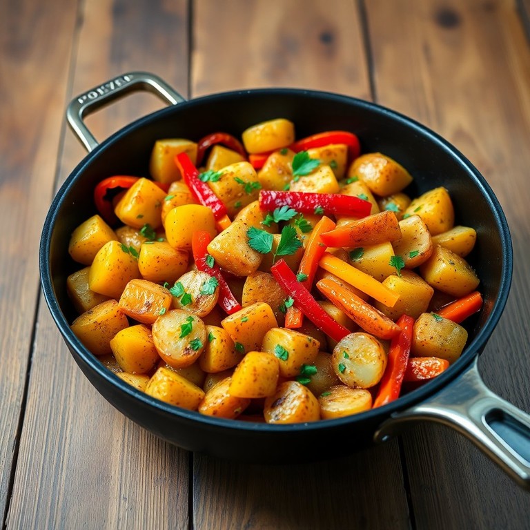 Ein herzhaftes Gemüsegericht mit knusprigen Kartoffeln und buntem Paprika, perfekt für ein gesundes und schmackhaftes Abendessen.