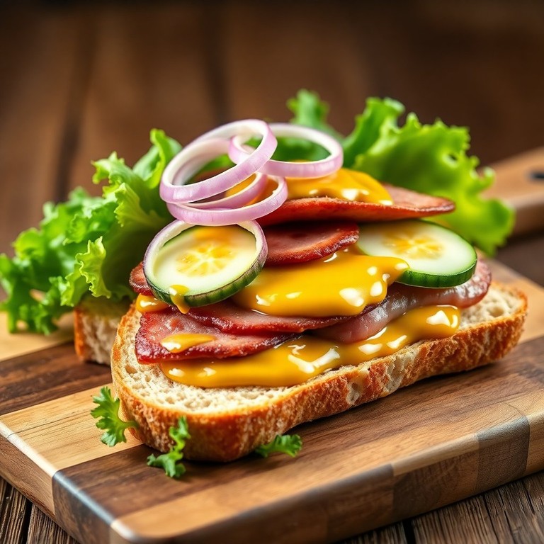 Ein herzhaftes Sandwich mit einer süßen Note, das die Aromen von Leberkäse, süßem Senf und frischen Gurken perfekt kombiniert.
