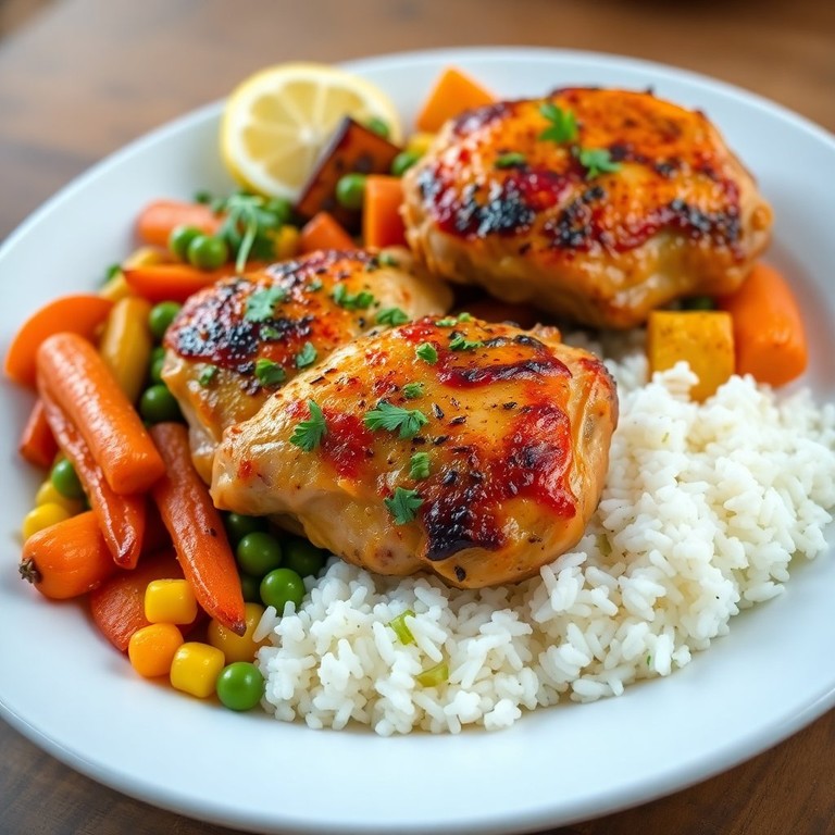 Un delicioso plato de pollo tierno acompañado de arroz y coloridas verduras, ideal para una comida familiar.