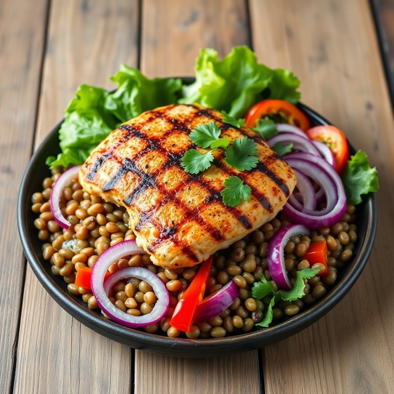Delicioso pollo marinado a la parrilla servido con una fresca ensalada de lentejas, ideal para una comida saludable y llena de sabor.