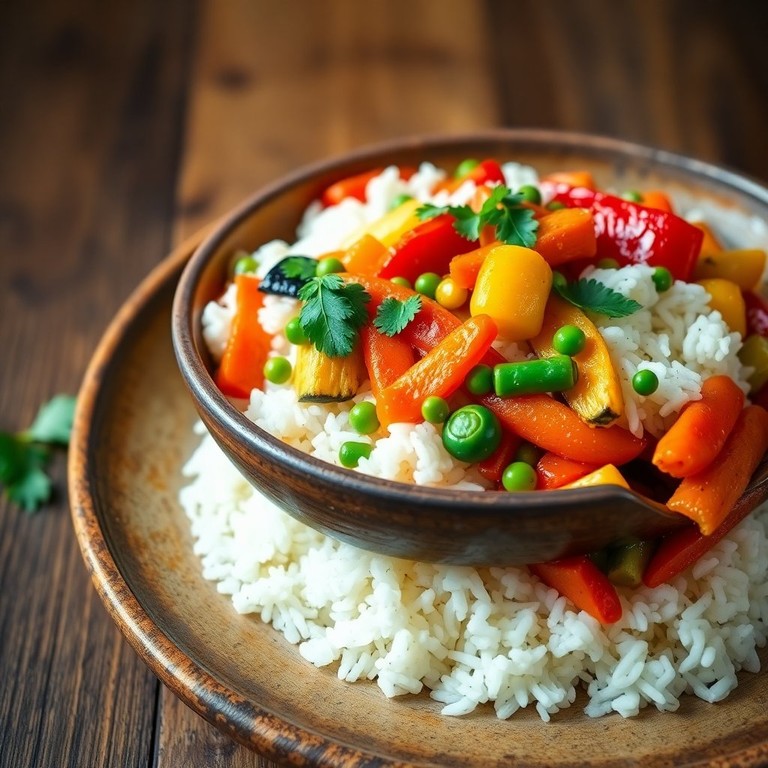Un plato vibrante y saludable que combina arroz blanco esponjoso con una mezcla colorida de verduras salteadas, perfecto para acompañar cualquier comida.