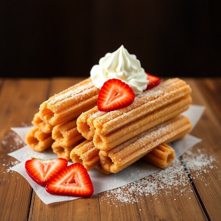 Estos churros son irresistibles, crujientes por fuera y suaves por dentro, perfectos para disfrutar con crema batida y fresas frescas. Ideal para un postre o merienda especial.