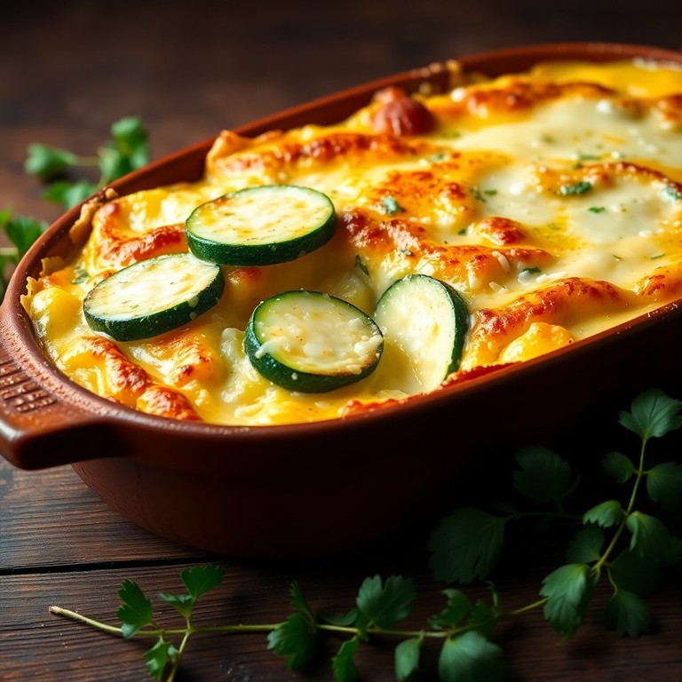 Ein cremiger Auflauf, der Kartoffeln und Zucchini in einer köstlichen Tomatensauce vereint.