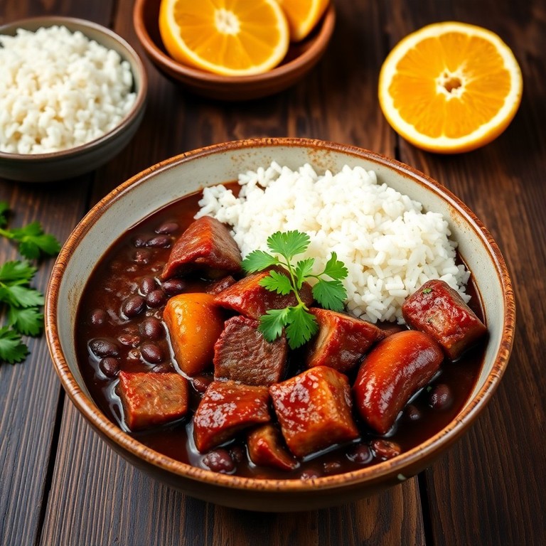 A feijoada é um prato clássico brasileiro, conhecido por sua combinação rica de sabores e texturas. Esta versão tradicional é feita com feijão preto, carne seca, linguiça e costela de porco, perfeita para um almoço em família.