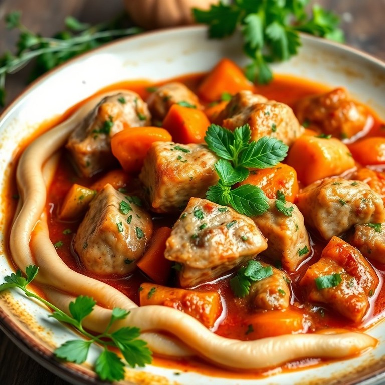 Ein delikates Ragout, das die Aromen Italiens mit frischen Kräutern und Gemüse vereint. Dieses Gericht kombiniert zartes Kalbfleisch mit einer aromatischen Sauce aus Weißwein und Hühnerbrühe, verfeinert mit frischen Kräutern.