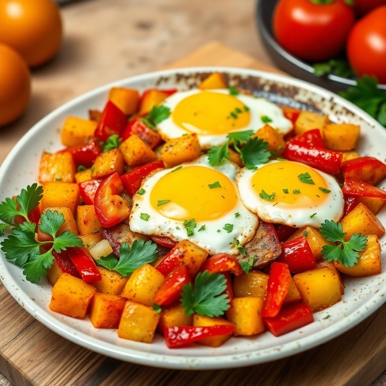 Diese Kartoffel-Paprika-Pfanne mit Ei ist ein einfaches und schmackhaftes Gericht, das perfekt für ein schnelles Abendessen geeignet ist. Die Kombination aus zarten Kartoffeln, süßen Paprika und herzhaften Zwiebeln, gekrönt mit einem leckeren Spiegelei, macht dieses Gericht zu einem wahren Genuss.
