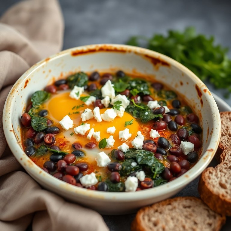 Un plato saludable y fácil de preparar, ideal para el desayuno, que combina huevos al horno con frijoles negros y espinacas frescas, todo ello realzado con el sabor del queso feta.