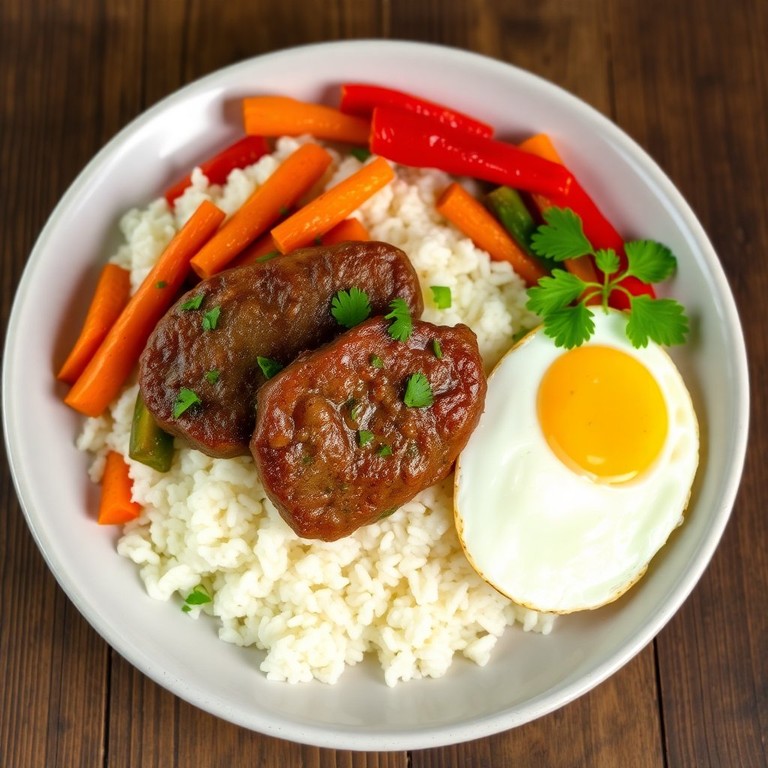 Un plato completo y nutritivo que combina arroz esponjoso con medallones de carne jugosa y una mezcla colorida de verduras salteadas. Ideal para una comida familiar o una cena especial.