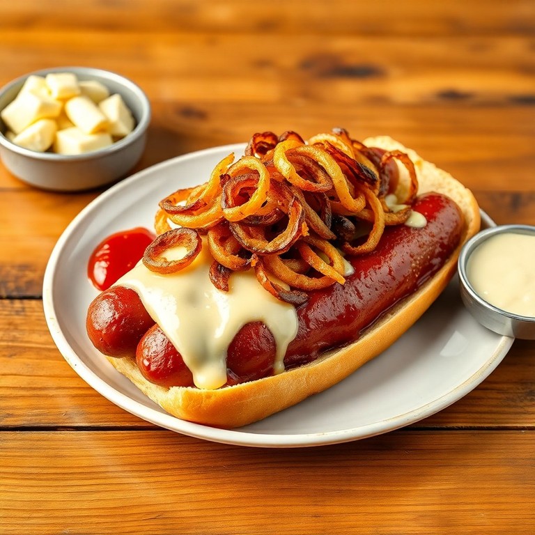 Ein herzhaftes Würstchen mit cremigem Käse und knusprigen Zwiebeln, perfekt für ein schnelles und schmackhaftes Gericht.