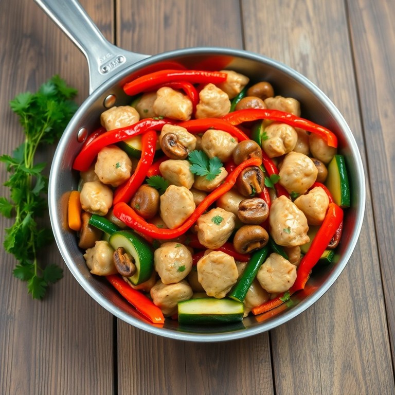 Ein gesundes und farbenfrohes Pfannengericht mit frischem Gemüse und saftigem Hähnchen, perfekt für eine ausgewogene Mahlzeit.