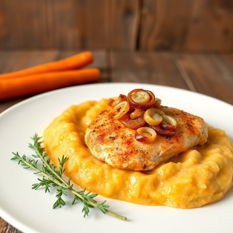Ein samtiges Püree, das perfekt zu saftigem Hähnchen passt. Dieses Gericht vereint die Süße der Karotten mit der Cremigkeit der Kartoffeln und dem zarten Geschmack des Hähnchens.