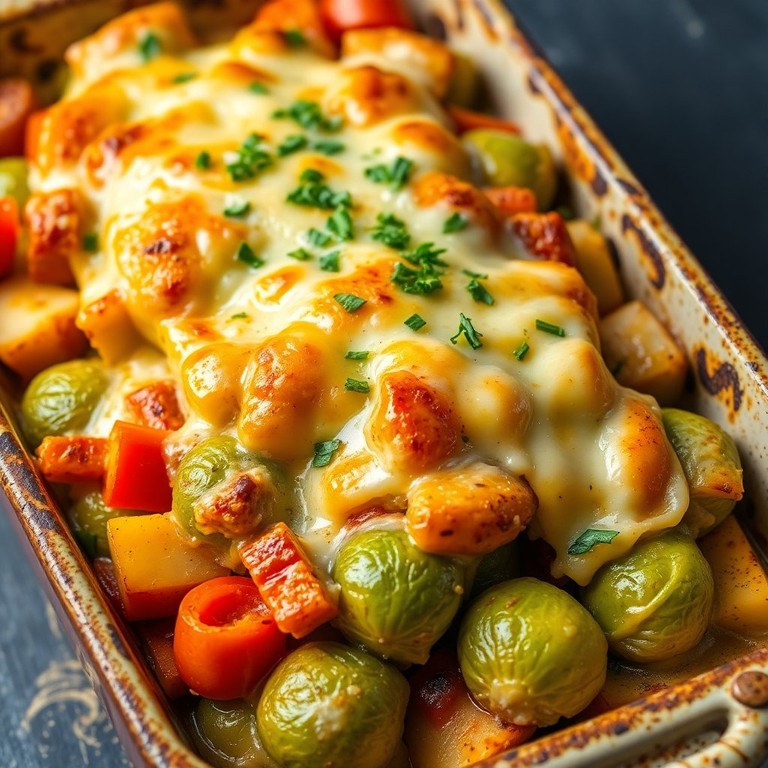 Tomaten-Rosenkohl-Pfanne mit Käse überbacken
