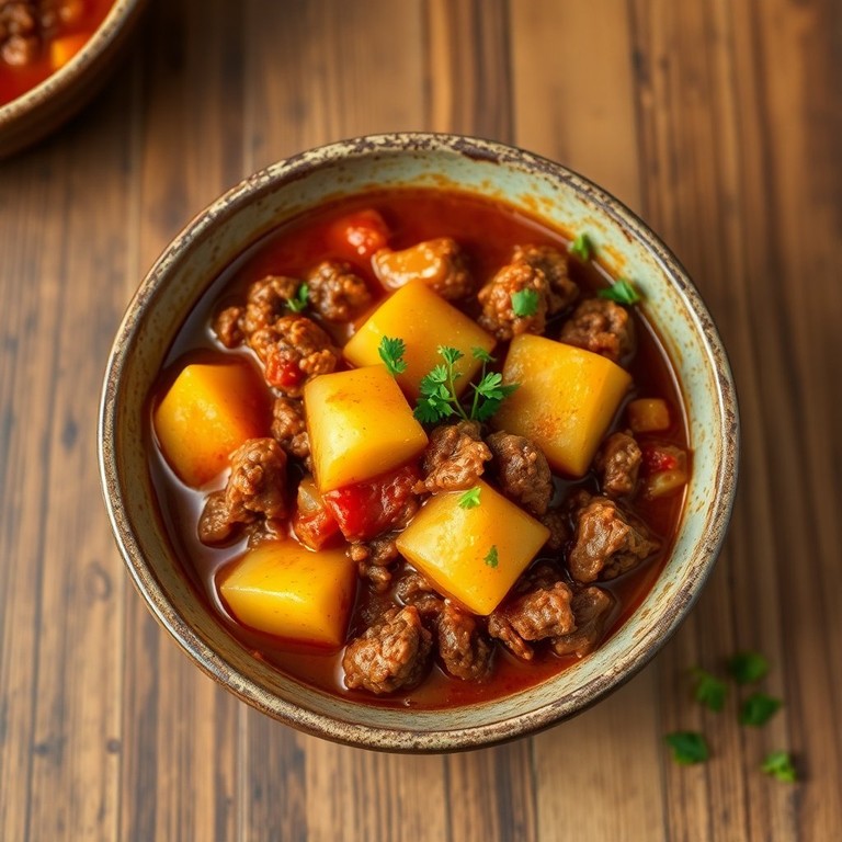 Un reconfortante guiso que combina carne molida, papas y cebolla en una salsa de tomate casera, ideal para disfrutar en familia.