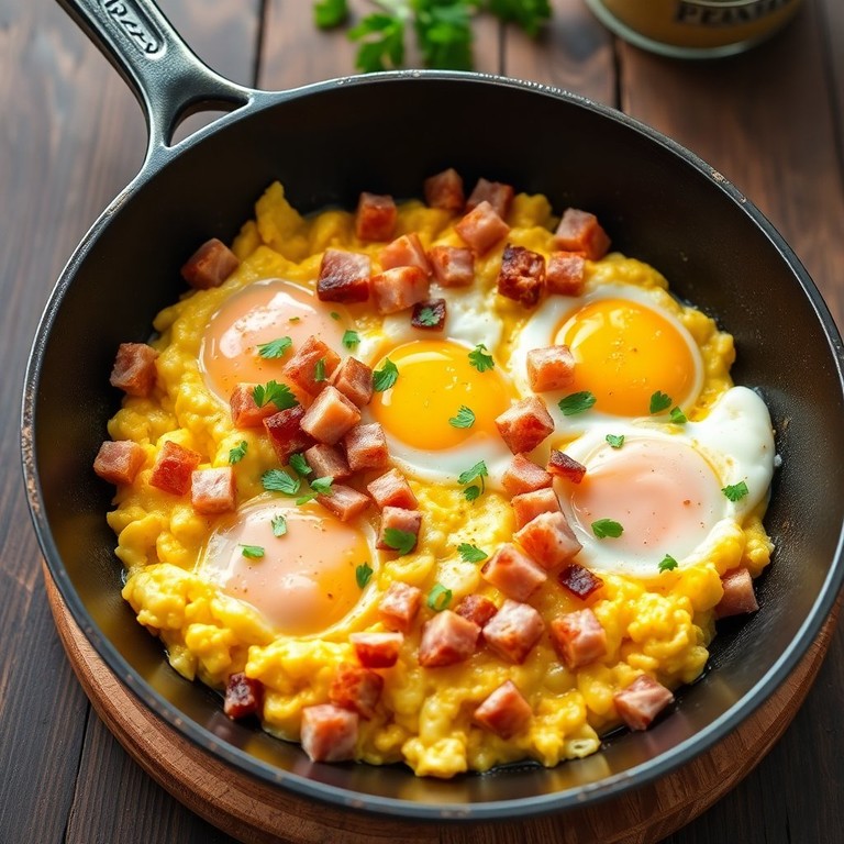 Eine schnelle und einfache Pfanne mit knusprigem Brot, zartem Schinken und fluffigem Rührei, perfekt für ein herzhaftes Frühstück oder ein schnelles Mittagessen.
