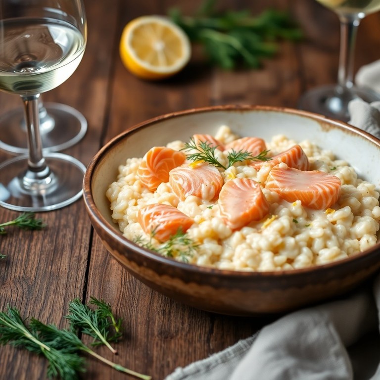 Romige risotto met zalm en een vleugje witte wijn, een luxe Italiaans gerecht.