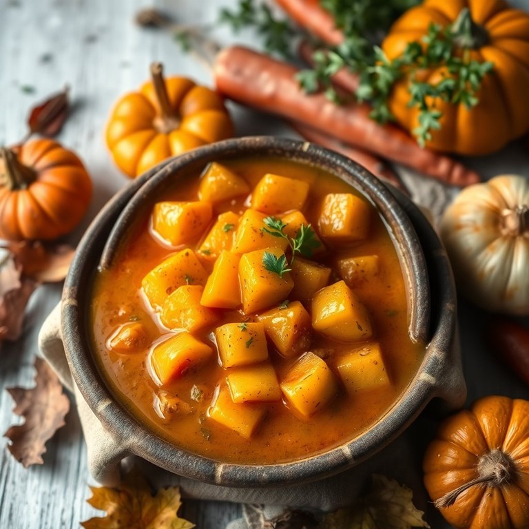 Ein wärmender Eintopf mit Kürbis, Kartoffeln und aromatischen Gewürzen, perfekt für kalte Tage.