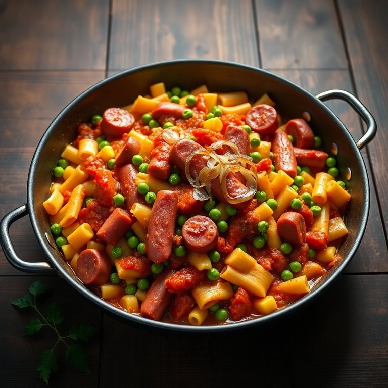 Ein herzhaftes und rustikales Pfannengericht, das perfekt für den kleinen Hunger ist. Die Kombination aus Bockwurst, frischem Gemüse und Nudeln sorgt für ein sättigendes und schmackhaftes Essen.
