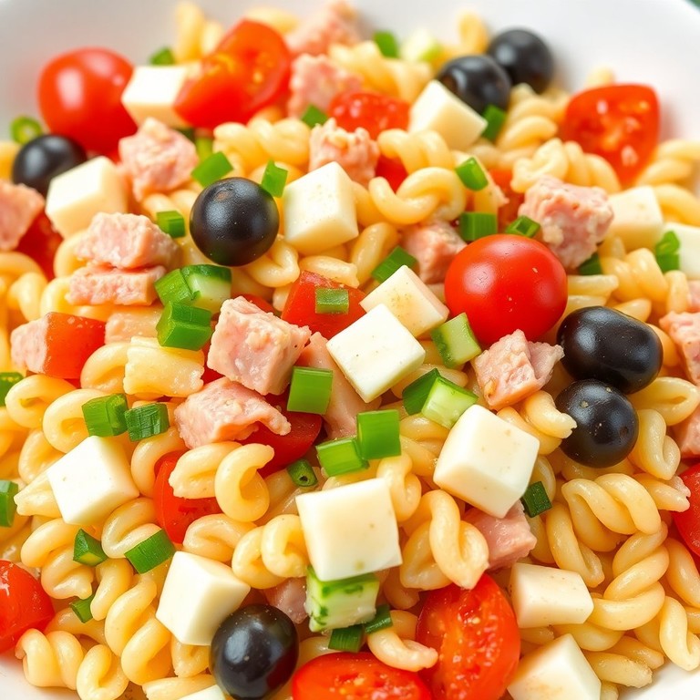 Erfrischender Nudelsalat mit Käse und Schinken