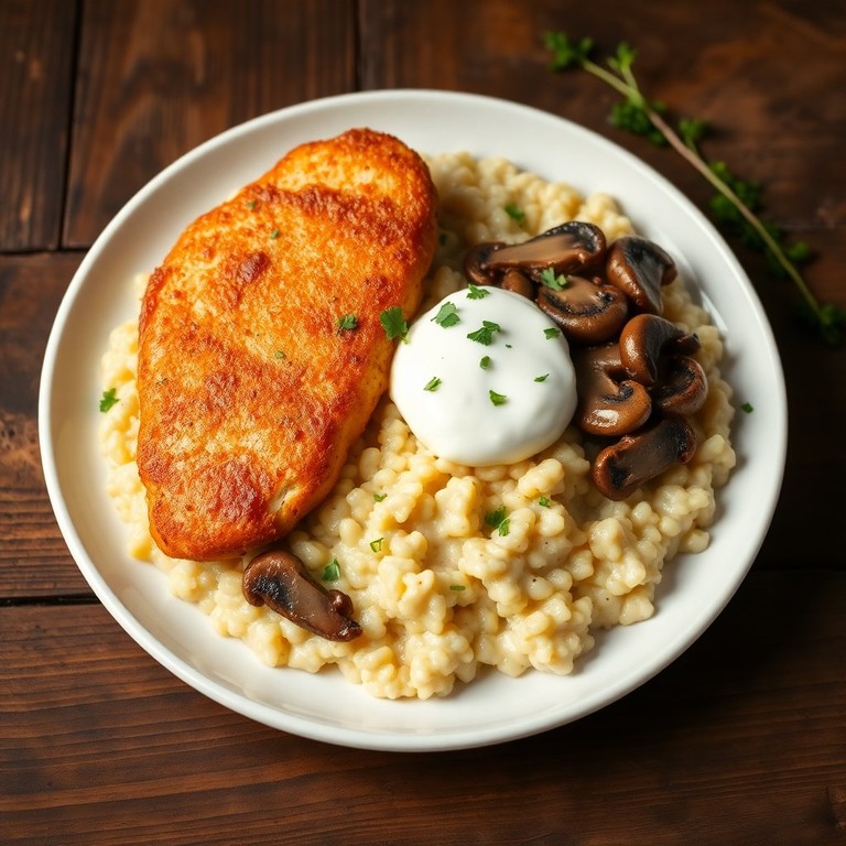 Cremiges Champignon-Risotto mit Putenschnitzel und Crème Fraiche